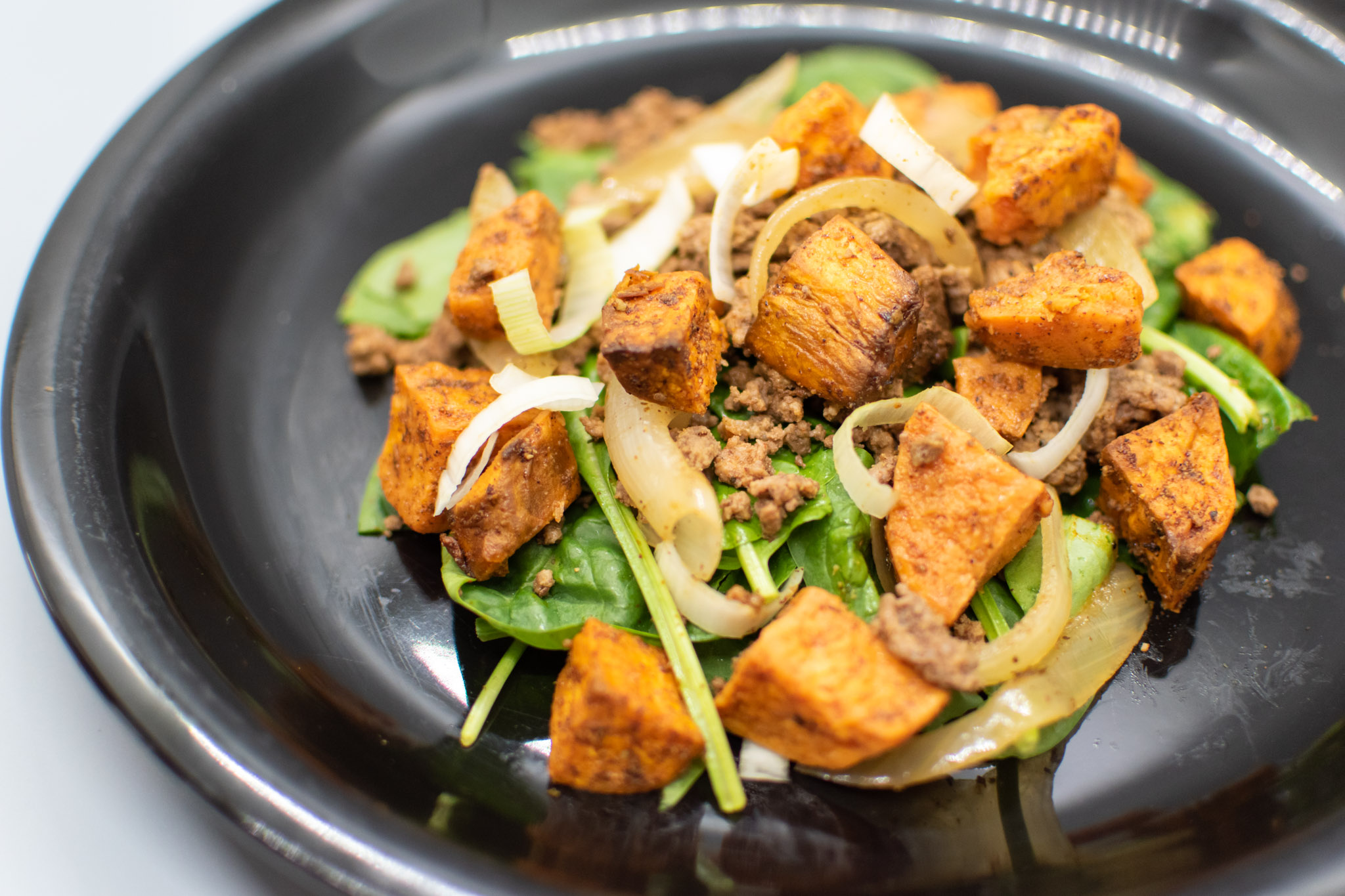 Sweet Potato and Beef Bowl with Spinach and Sauteed Onions