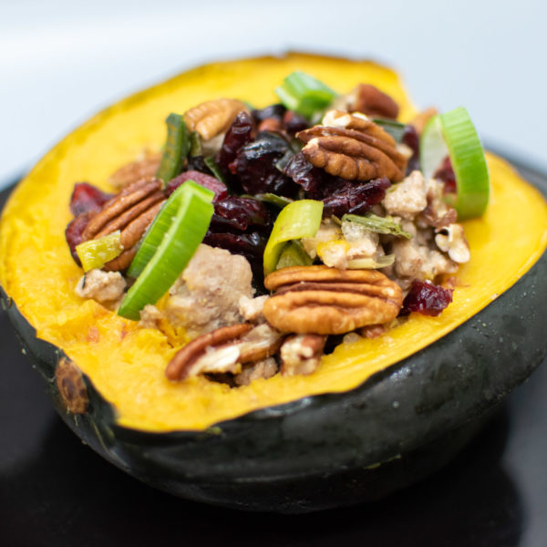 • Stuffed Acorn Squash with Turkey Cranberries Leeks and Pecans