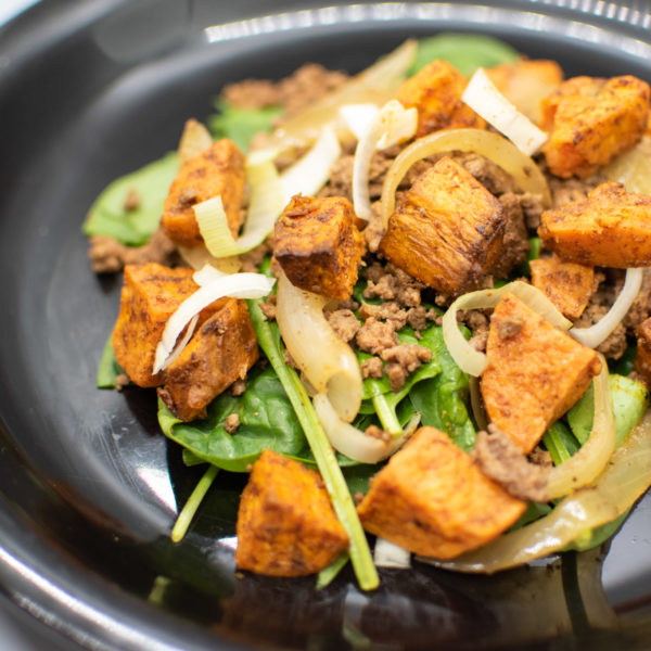 • Sweet Potato and Beef Bowl with Spinach and Sauteed Onions